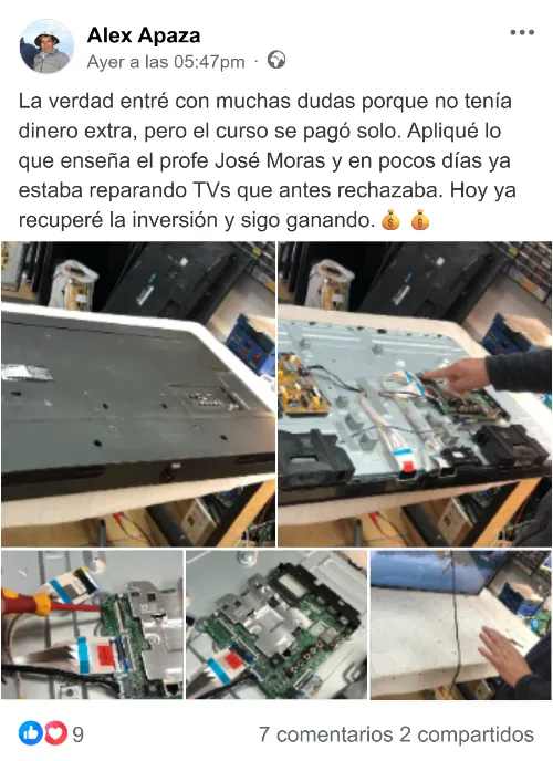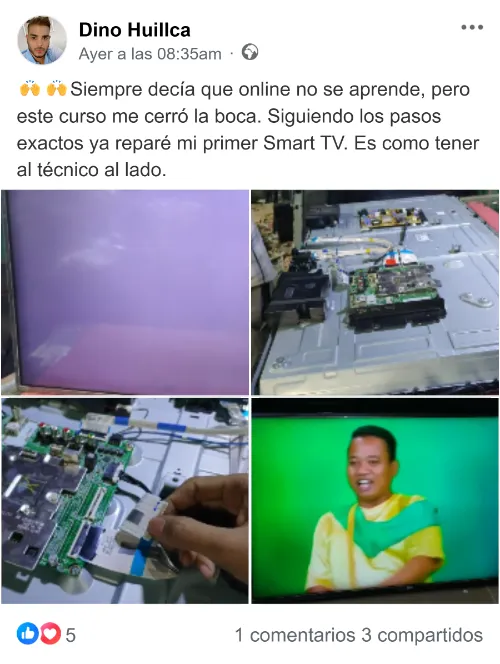 Al día de hoy he visto la necesidad de muchos jóvenes de emprender su propio negocio; por eso he decidido crear esta capacitación: un programa diseñado para que cualquier persona, incluso sin experiencia previa, pueda aprender a reparar televisores y generar ingresos en el menor tiempo posible.